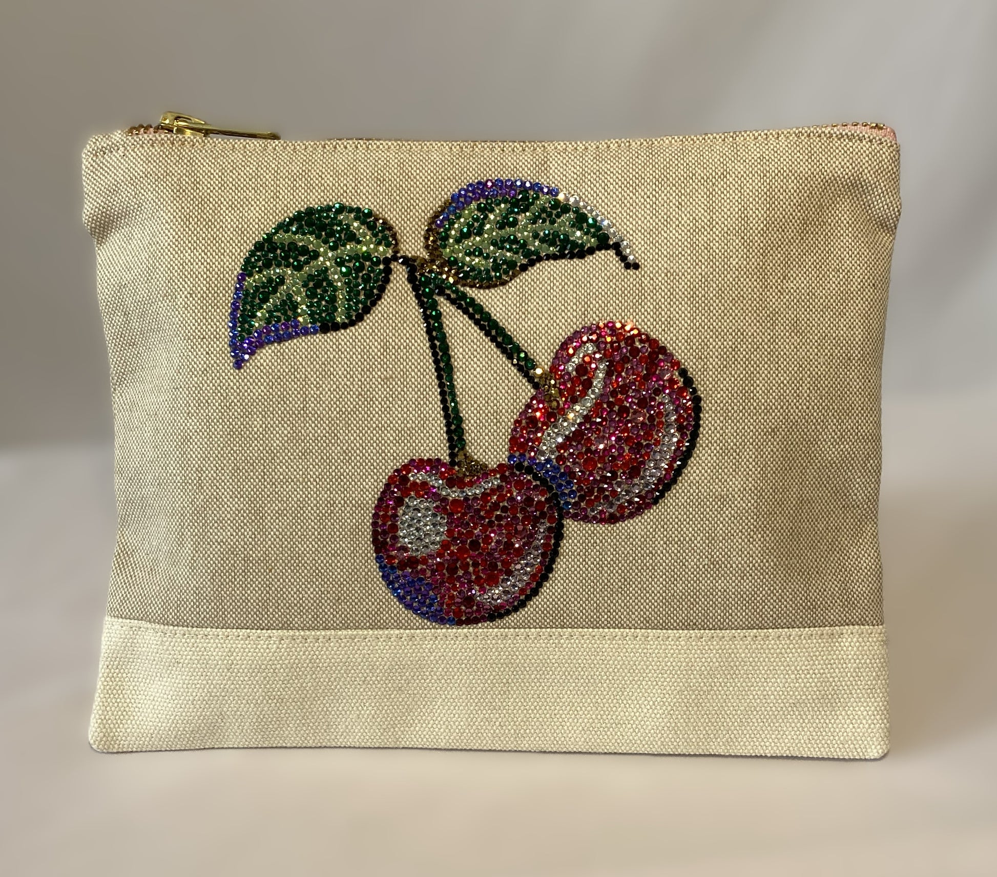 Applikationen aus präzise facettierten Glas-Strasssteinen in Variationen von Rot- und Rosétönen, Grün, Schwarz, mit hochreflektierendem Schliff für intensive Lichtbrechung.